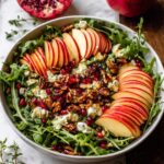 A vibrant Autumn Harvest Honeycrisp Apple and Feta Salad featuring toasted spiced pecans and pumpkin seeds, crispy prosciutto, fresh arugula, crisp apples, creamy avocado, and jewel-like pomegranate arils, all tossed in a flavorful homemade apple cider vinaigrette.