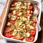 - Bake the tomatoes: Bake for 20–25 minutes until the tomatoes are tender and juicy and the feta is slightly golden but not too dark. Remove from oven and let rest for 5 minutes.