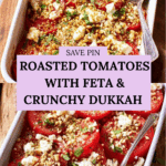 Keywords: baked tomatoes, feta, dukkah, flatbread, Mediterranean, vegetarian recipe, easy oven dish