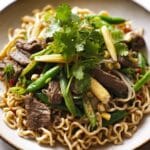 A vibrant and flavorful beef stir-fry featuring tender strips of marinated rump beef cooked quickly with aromatic spices, fresh vegetables, and rice noodles. This dish delivers a perfect balance of heat from chili, citrus brightness from lime, and nuttiness from roasted peanuts, all tossed in savory soy and fish sauces for a quick and satisfying meal.