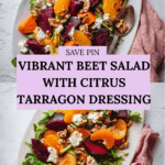 Keywords: beet salad, citrus dressing, tarragon dressing, roasted beets, goat cheese salad, walnut salad, healthy salad, vegetarian salad