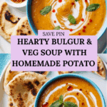 This wholesome Bulgur & Veg Soup with sizzled mint oil and potato flatbreads is a comforting, nutritious meal packed with root vegetables, bulgur, and red lentils. The smooth, spiced soup is enriched with fragrant mint oil and served alongside homemade, soft potato flatbreads, perfect for dipping and soaking up the flavorful broth.