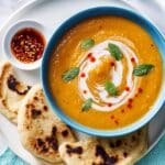 This wholesome Bulgur & Veg Soup with sizzled mint oil and potato flatbreads is a comforting, nutritious meal packed with root vegetables, bulgur, and red lentils. The smooth, spiced soup is enriched with fragrant mint oil and served alongside homemade, soft potato flatbreads, perfect for dipping and soaking up the flavorful broth.