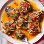 This charred chicken thighs recipe combines bold flavors of fish sauce, lime, and chili caramel to create a vibrant and mouthwatering dish. Perfectly marinated and cooked to crispy perfection, it’s an exciting meal to serve with fragrant jasmine rice.