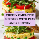 Keywords: cheesy omelette burgers, egg burgers, quick breakfast, brunch recipe, cheesy egg sandwich, pea omelette, easy burger recipe