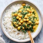 - Serve: Spoon the chickpea and spinach mixture generously over cooked rice and enjoy your wholesome and comforting bowl.