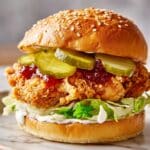 These crispiest buttermilk fried chicken burgers combine juicy, flavorful chicken thighs with a perfectly crunchy coating. Marinated in buttermilk and pickle brine, then double-dusted in seasoned flour, they’re fried to golden perfection and served in soft brioche buns.