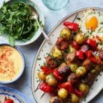 These crispy potato, pepper, and chorizo skewers combine tender baby new potatoes, sweet red peppers, and spicy cooking chorizo grilled to perfection. Served with a zesty garlic lemon mayonnaise, this dish is perfect for barbecue gatherings or a flavorful weeknight dinner.