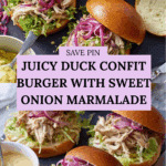 Keywords: Duck confit burger, gourmet burger, French recipe, brioche buns, onion marmalade, duck leg confit, rocket salad, easy duck recipe
