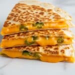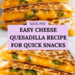 This Easy Cheese Quesadilla recipe is a quick and delicious way to enjoy a classic Mexican-inspired snack or meal. With melted cheddar cheese, sautéed green chili pepper, and onion sandwiched between soft flour tortillas, then pan-fried in butter for a crispy, golden finish, it’s a comforting treat perfect for any time of day. Serve it with sour cream and guacamole for added creaminess and flavor.