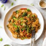 - Garnish and Serve: Sprinkle the finely chopped green onions and sesame seeds over the assembled lo mein. Serve immediately and enjoy your delicious homemade chicken lo mein.