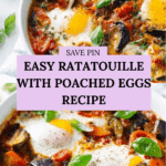 A flavorful and comforting easy ratatouille recipe topped with perfectly poached eggs. This French-inspired vegetable stew features tender aubergine, courgettes, peppers, and onions simmered in a rich tomato sauce with aromatic rosemary and balsamic vinegar, finished with fresh basil and served with crusty bread.