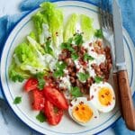 This Egyptian egg salad is a vibrant and flavorful dish combining soft-boiled eggs, creamy fava beans, cumin-spiced onions, and a tangy tahini-lemon dressing. Served atop fresh wedges of Little Gem lettuce and accompanied by juicy tomatoes, it’s a satisfying and wholesome salad inspired by Middle Eastern flavors, perfect for a light lunch or dinner.