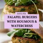 These delicious falafel burgers combine the classic Middle Eastern flavors of chickpeas, garlic, and spices into a satisfying vegetarian patty. Crispy on the outside and tender inside, served with creamy houmous and fresh watercress on toasted burger buns, they make a perfect meat-free alternative for any burger lover.