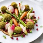 - Step 8: Before serving, blend the sauce again to recombine. Spoon sauce onto warmed plates, add falafel and poached vegetables, scatter with pomegranate seeds, and serve immediately.