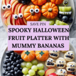 Keywords: Halloween fruit platter, spooky fruit platter, mummy bananas, fruit snacks, kids healthy Halloween treats, fruit platter with decorations
