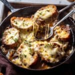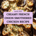 This French Onion Smothered Chicken combines tender, thin-cut chicken breasts with rich caramelized onions, mushrooms, and a creamy white wine sauce. Topped with toasted French bread and melted Gruyere, it’s a comforting and elegant dish perfect for any night of the week.