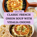 A classic French Onion Soup recipe featuring caramelized Vidalia onions simmered in a rich blend of beef and chicken stocks, enhanced with dry sherry and fresh thyme. Served with toasted baguette slices topped with melted provolone cheese, finished under the broiler for a golden, bubbly crust.