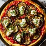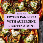 This frying pan pizza features a homemade dough topped with a rich garlic and passata sauce, tender golden aubergine slices, creamy ricotta, and fresh mint. Cooked entirely on the stovetop, it offers a deliciously crispy base and vibrant Mediterranean flavors without the need for an oven.