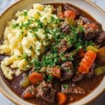 12. Serve: Serve the goulash hot, garnished with fresh parsley and a dollop of sour cream if desired. Traditionally accompanied by spätzle but equally delicious with mashed potatoes, egg noodles, or crusty bread.