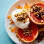 - Serve: Allow the brûléed grapefruit to cool slightly, then serve each half topped with a dollop of 1/2 cup yogurt and a generous sprinkle of the quinoa granola.