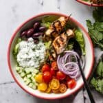 - Assemble the Dish: Divide the salad among serving bowls, top each with a dollop of tzatziki sauce, and place several chicken souvlaki skewers on top. Serve immediately and enjoy your fresh Greek grilled chicken souvlaki salad.