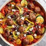 These Greek lamb meatballs simmered with chargrilled vegetables and tender new potatoes offer a deliciously comforting meal full of Mediterranean flavors. The combination of garlic, olives, feta, and fresh mint adds vibrant taste and texture that’s perfect for a satisfying dinner.