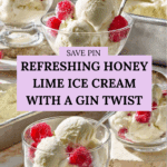 Keywords: honey lime ice cream, no churn ice cream, gin ice cream, homemade ice cream, easy frozen dessert, lime zest, raspberry topping