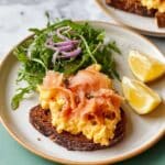 A delicious and nutritious breakfast featuring creamy hot smoked trout scrambled eggs served with a fresh rocket salad and hearty dark rye toast. This recipe combines smoky, savory flavors with a zesty lemon and mustard dressing for the salad, making it a perfect start to your day.
