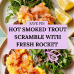 This hot smoked trout scramble paired with a fresh rocket salad is a simple yet flavorful breakfast or brunch option. The creamy eggs combined with smoky fish and peppery greens make for a balanced and satisfying meal.