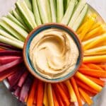 Store the hummus covered in the refrigerator for up to three days. Keep the sliced vegetables separate and fresh by only cutting them just before serving. To reheat, the hummus is best enjoyed chilled or at room temperature, though you can warm it slightly if preferred.