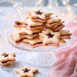 Jammy star cookies are delightful buttery shortbread stars sandwiched with a luscious raspberry or strawberry jam and buttercream filling. These charming cookies feature a smaller star-shaped cutout on the top cookie, revealing the vibrant jam inside, perfect for tea time or as a sweet gift.