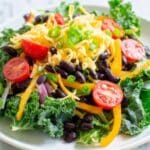 4. Step 4: Divide the dressed kale among 4 dinner plates. Top each portion with one quarter of the shredded cheddar cheese, black beans, sliced bell peppers, halved grape tomatoes, chopped green onions, and tortilla strips.