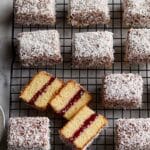 Keywords: Lamingtons, Australian dessert, sponge cake, chocolate icing, raspberry jam, whipped cream, coconut coating