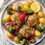 - Coat Ingredients: Add the boneless, skinless chicken thighs along with halved baby potatoes, broccoli florets, sliced red bell pepper, and red onion wedges into the marinade. Toss thoroughly to ensure all pieces are evenly coated with the flavorful mixture.