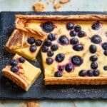 A rectangular tart with a thick, golden brown puff pastry crust forms the base layer, with visible flaky edges. The middle layer is a creamy, light yellow custard that fills the tart's surface evenly. Scattered on top are whole blueberries, their deep blue color contrasting with the creamy custard, some surrounded by small purple juice stains. The tart is dusted lightly with white powdered sugar. Two pieces are cut from the bottom left corner, showing the crust’s thickness and the smooth custard inside. The tart rests on a dark slate board placed on a white marbled surface, with some pastry crumbs around. Photo taken with an iphone --ar 4:5 --v 7
