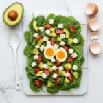 A vibrant and nutritious Mediterranean Quinoa Salad featuring tender red quinoa, fresh spinach and arugula, creamy avocado, tangy feta cheese, and sweet red bell pepper, all tossed in a homemade balsamic vinaigrette and topped with perfectly soft-boiled eggs. This wholesome salad is perfect for a light lunch or a refreshing side dish.