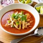 This vibrant Mexican chicken soup features a smooth puree of tomatoes, dried chili, and spices, simmered with tender chicken breasts and finished with fresh lime juice. Served with crunchy tortilla chips or homemade tortilla strips and fresh toppings like avocado, red onion, and coriander, this comforting soup is perfect for a flavorful meal with a touch of zest.