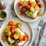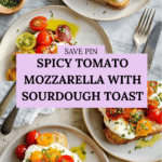 This Mozzarella with spicy tomatoes and garlicky toast is a fresh and flavorful dish perfect for a light lunch or appetizer. The juicy tomatoes are marinated with a zesty dressing, paired beautifully with creamy mozzarella and crunchy garlic-rubbed sourdough.