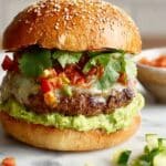 Nacho cheeseburgers combine the best of two favorites: juicy beef patties topped with melty cheddar and the zesty crunch of nachos. This easy recipe adds a flavorful twist with guacamole, chipotle mayo, and fresh coriander, perfect for a quick and satisfying meal.