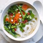 - Assemble the Soup: Place the cooked and rinsed rice noodles into serving bowls. Pour the hot broth with vegetables over the noodles.
