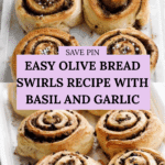 Delightful olive bread swirls with a flavorful olive and basil paste, perfect as an appetizer or snack. These swirls feature a soft white dough rolled with a savory mix of black olives, green olives, garlic, basil, and anchovies, baked to a golden crisp.