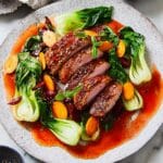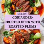 This one-pan coriander-crusted duck features tender duck breasts with a crispy, aromatic crust, served alongside roasted plums and pak choi greens. The dish is finished with a luscious honey-soy glaze infused with red wine vinegar and a hint of chili for a perfect balance of sweet, tangy, and spicy flavors.