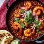 This one-pot prawn and lentil curry is a rich, flavorful dish combining tender red lentils simmered in a spiced tomato-based sauce with succulent prawns. The recipe is simple, hearty, and perfect for a wholesome weeknight meal. It’s versatile too—with options to make it vegan or substitute chicken. Aromatic spices, garlic, ginger, and tangy tamarind balance beautifully, making it an inviting dish served with fresh green chillies, coriander, and pickled onions.