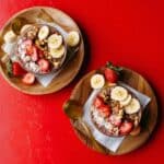 Two wooden round plates rest on a flat bright red surface, each holding a clear glass bowl filled with a layered dish. The bottom layer in the bowls is a grainy, tan textured base, topped with pieces of red strawberries and sliced yellow banana rounds. On top of the fruit, there are small chunks of white coconut flakes and light brown chopped nuts. Beside each bowl on the wooden plates, there is a small stack of banana slices arranged neatly on a white paper liner. A wooden spoon is placed on one plate, slightly inside the bowl, and a gold-colored spoon lays next to the other bowl on the paper. The whole setup contrasts against the red background. photo taken with an iphone --ar 4:5 --v 7