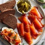 - Serve: When ready to serve, set the salmon on a cutting board and use a sharp knife to thinly slice the salmon, avoiding the skin. Arrange on a platter and serve alongside soft cheese, rye bread or bagels, dill pickles, and chopped dill for garnish.