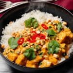 - Finish and Serve: Turn off the heat, then stir in the lime juice. Scatter fresh chopped coriander, sliced red chilli, and chopped peanuts over the curry if desired. Serve hot with cooked rice.