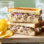 - Step 2: On one slice, layer the drained tuna and finely sliced red onion. Top with the other slice, buttered side facing outwards to form a sandwich.