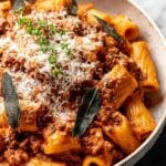 A rich and hearty Pot Roast Sunday Sauce served with rigatoni, combining tender slow-roasted beef chuck and spicy Italian sausage meatballs in a robust tomato and red wine sauce, finished with cream, parmesan, and butter for a comforting Italian-inspired meal perfect for Sunday dinner.