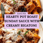 - Serve: Serve the rigatoni topped with generous amounts of grated parmesan and optionally crispy butter-fried herbs for garnish and added flavor. Enjoy your comforting Pot Roast Sunday Sauce and rigatoni!